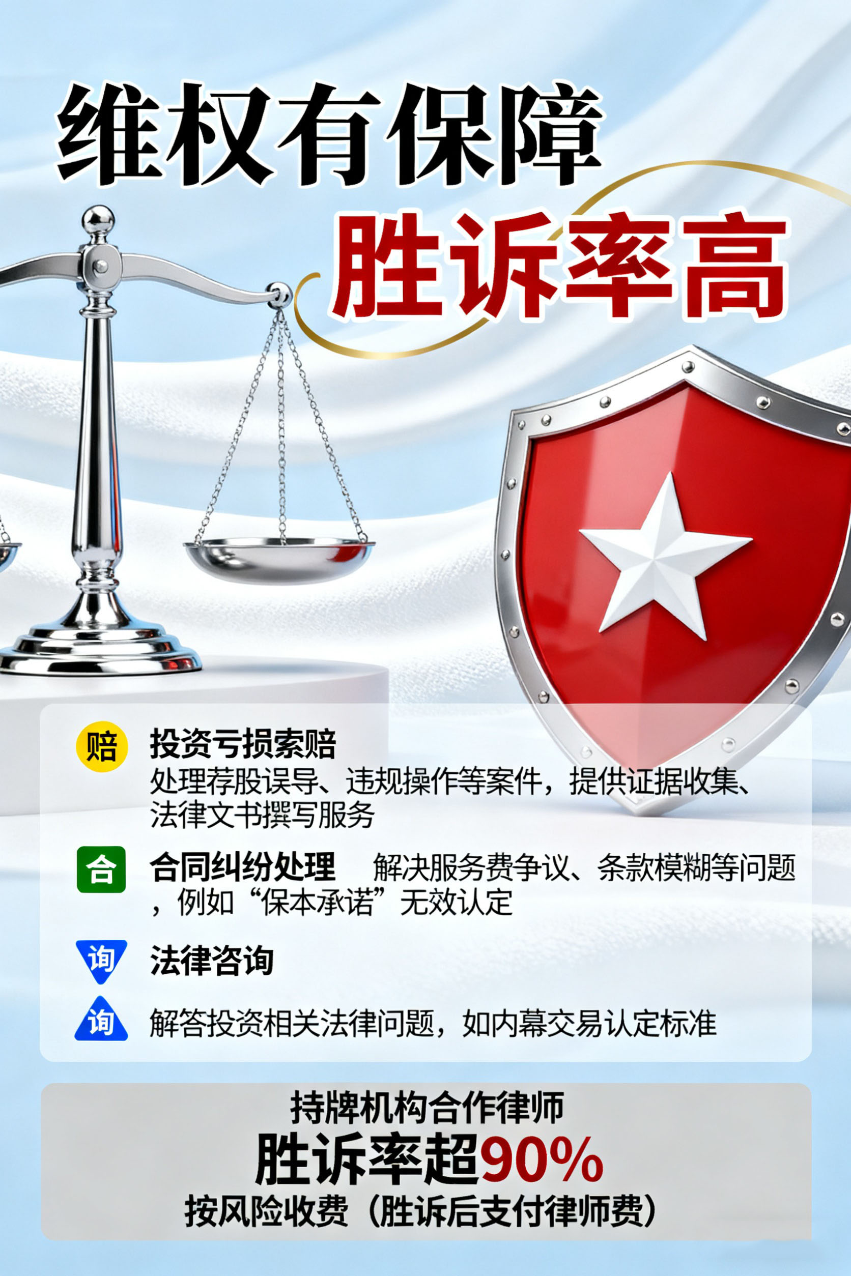 服务内容:投资亏损索赔:处理荐股误导、违规操作等案件,提供证据收集、法律文书撰写服务。合同纠纷处理:解决服务费争议、条款模